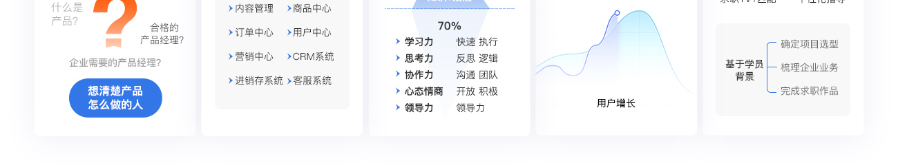課程內容面向不同背景的學員成功轉型產品經理,從事互聯網行業,成為企業核心人才的人群,通過六步進階訓練,掌握產品經理必備技能;產品的課程通過常用產品工具、產品思維及專業技能提升,進階為項目需求調研、業務流程梳理、完成個性化項目實戰、再通過運營數據分析能力培養,覆蓋C/B端行業的不同領域互聯網產品經理所必需的的中級產品經理專業課程。